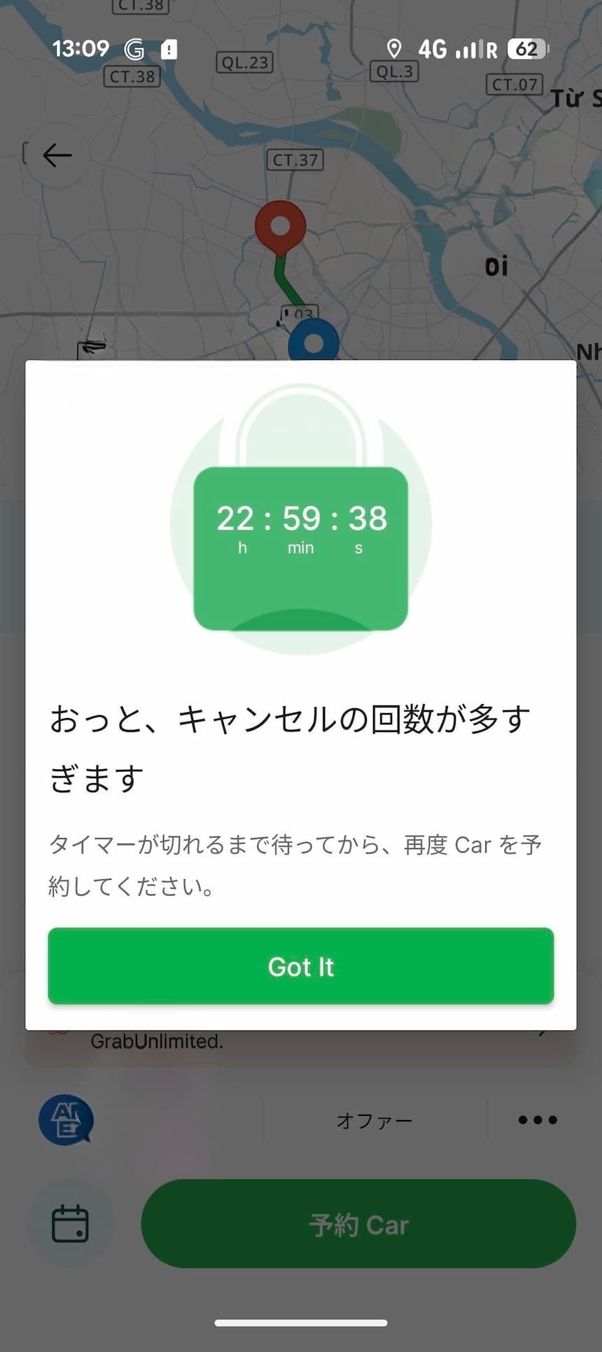 筆者も一度Grab使用中にこの画面が出て使えなくなったことがありました。幸い携帯を2台持っていたため丸一日Grabが使えないということは免れましたが…読者の皆さんはくれぐれもご注意を。