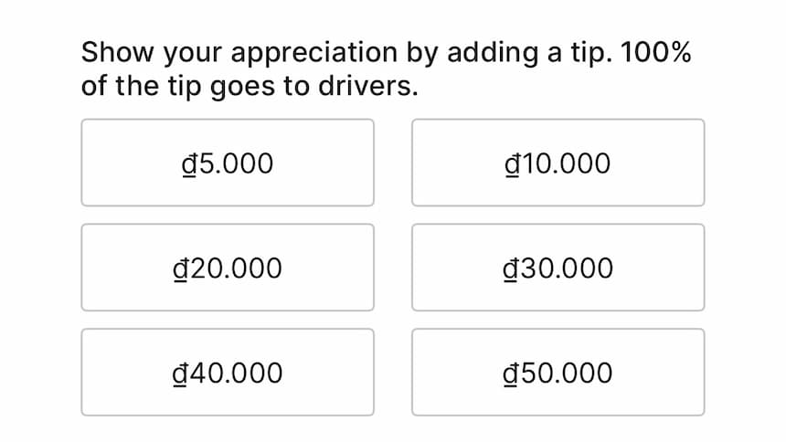 チップは基本不要だが、親切な対応をしてもらったら1万ドン(約60円・2025年10月現在)程度渡すと良い。Grabアプリは支払後にドライバー評価とチップ画面が表示されるので、そのままアプリ上でチップを支払うことができる。