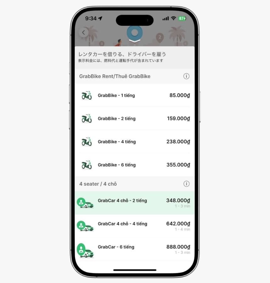 表示されるベトナム語の「chỗ(チョー)」は「座席(seat)」、「tiếng(ティエン)」は「時間(hour)」の意味で、ドライバー付きの車を数時間単位でレンタルでき、燃料費込みの明朗会計。