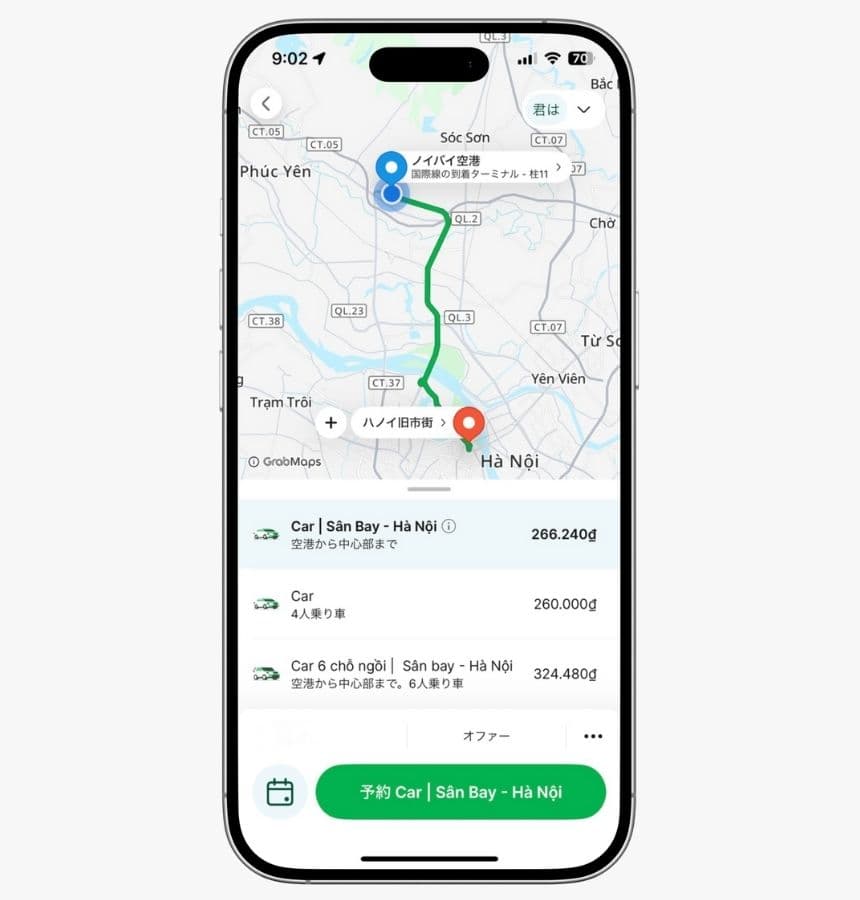 ハノイで1日車を専用で使いたい、または観光地をまとめて回りたいときは、Grabのレンタル/チャーター機能が便利だ。