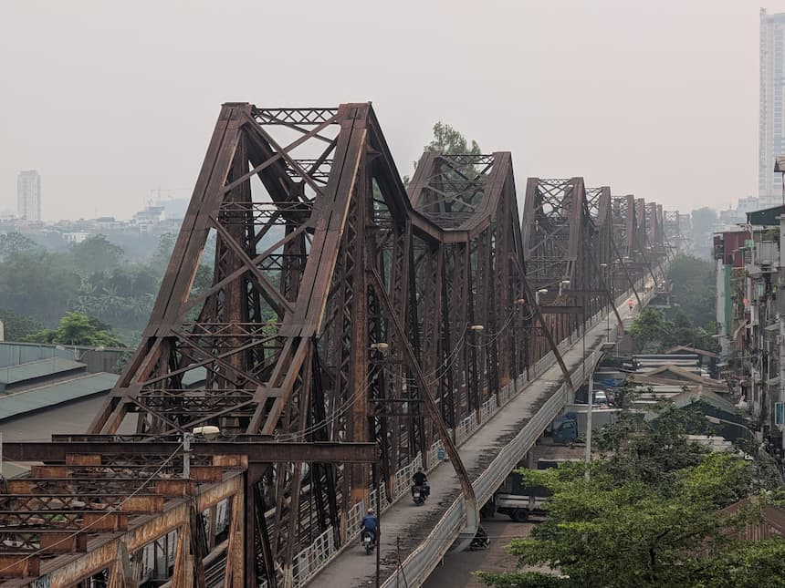 橋の中央を鉄道、その両脇をバイク・自転車、いちばん外側を歩行者――という3層構造になっていて、今もハノイ〜ハイフォン、ハノイ〜ドンダン(中国国境)、ハノイ〜ラオカイを結ぶ鉄道路線がこの橋を通っています。