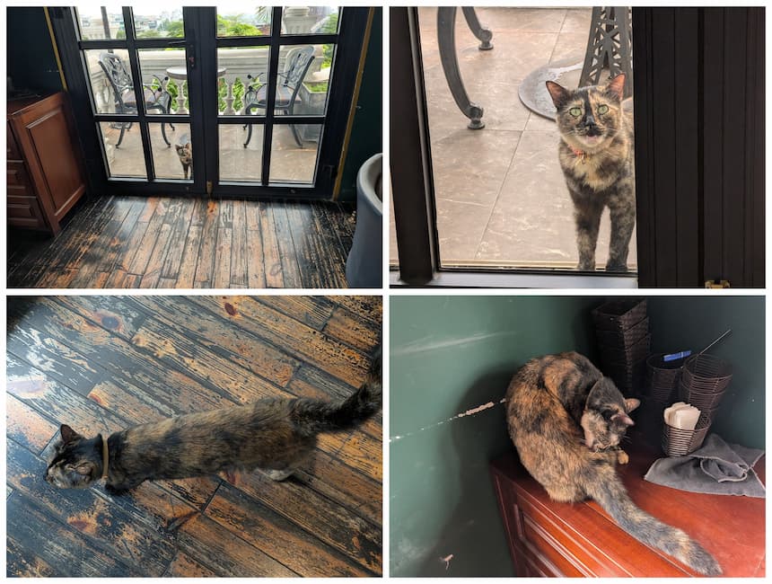 私が訪れた日は晴れて気温も高かったので、4階のテラスでくつろいでいました。すると猫がドア越しに「開けて」と訴えてきたので、開けてあげました。